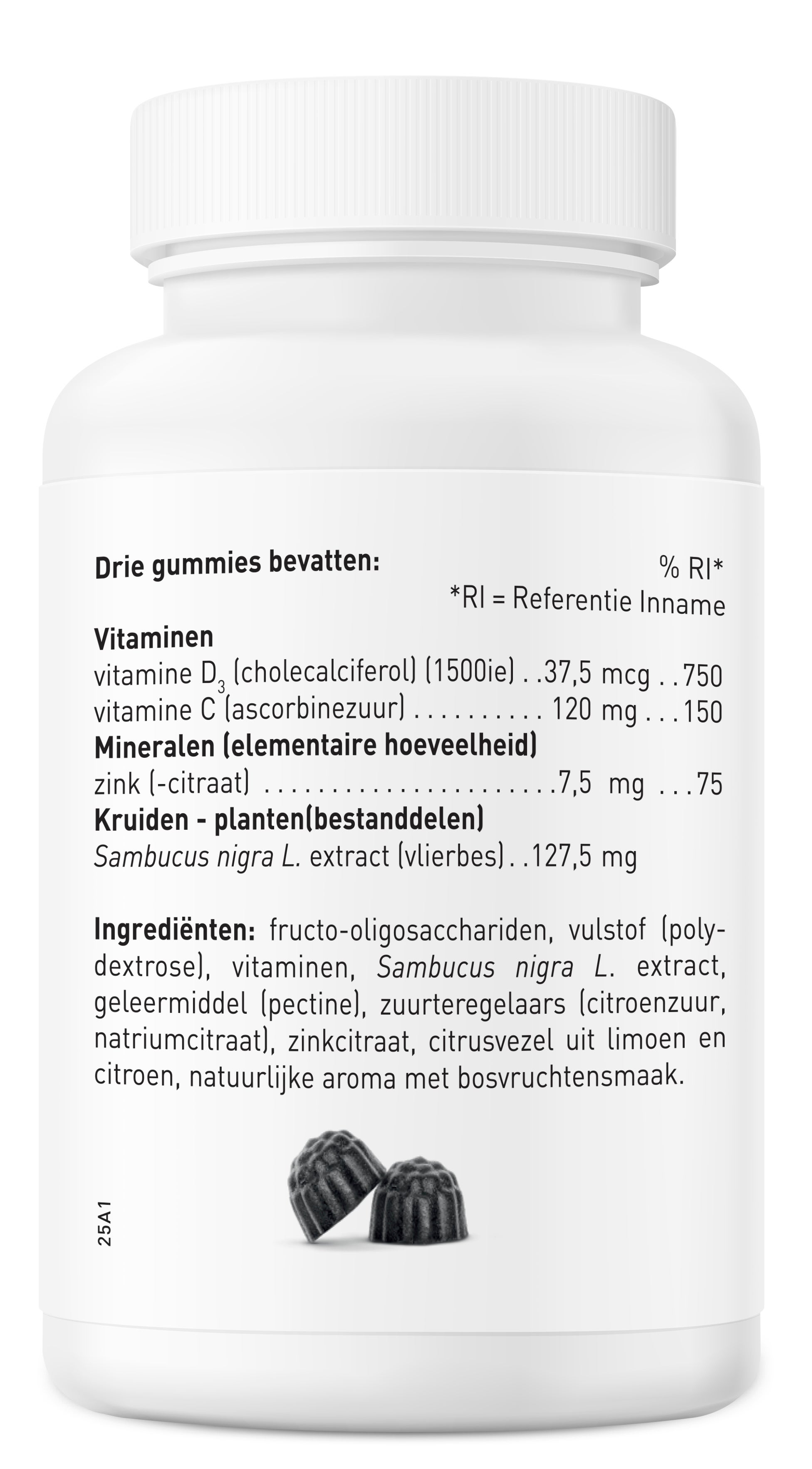 Met hoge doseringen vitamine C, D en zink. Daarnaast bevatten de gummies ook vlierbesextract. In lekkere bosvruchtensmaak.