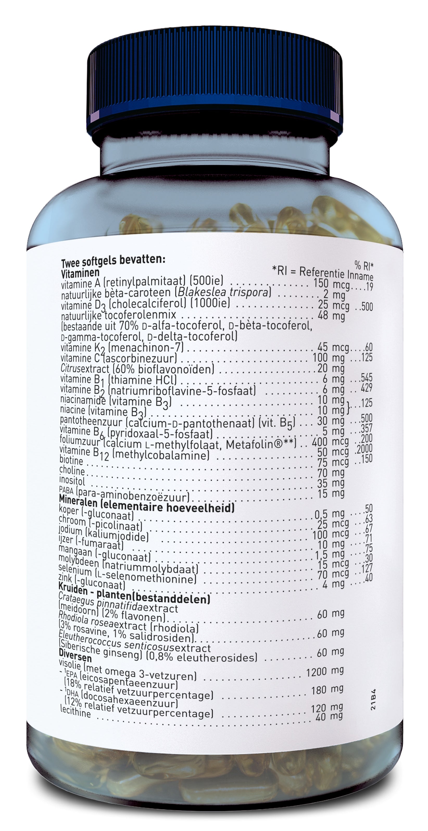 Multi 50+ is een soft multivitamine-supplement speciaal voor actieve vijftigplussers die van het leven genieten, en wat aanvulling op een gezonde voeding en levensstijl kunnen gebruiken. Deze soft-Multi bevat de omega 3-vetzuren EPA en DHA, ter ondersteuning van het hart, Siberische ginseng en vitamine D.